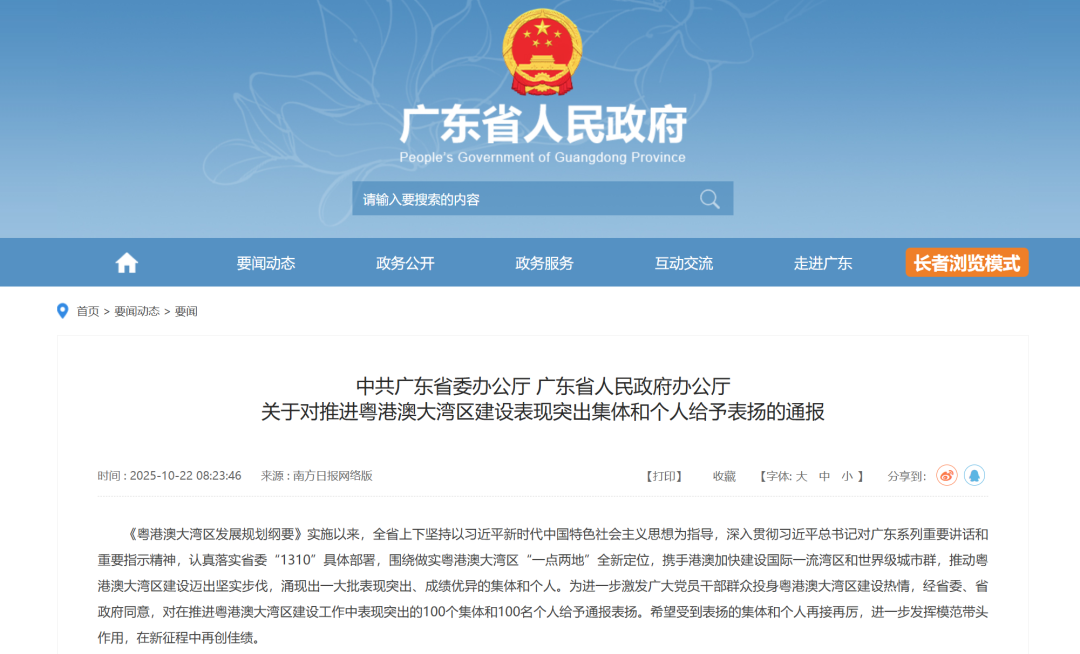 中共广东省委办公厅、广东省人民政府办公厅联合发布通报,对在推进粤港澳大湾区建设工作中表现突出的100个集体和100名个人予以通报表扬。