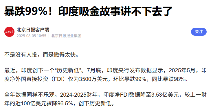 印度央行的数据简直不忍直视,2025财年的FDI数据,也就是外国直接投资净额,直接从去年的将近100亿美元,跌到了3.53亿美元,跌幅同比高达96.5%。